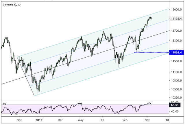 However, if the price trades below the October 31 low of 12800, we might see a steeper correction taking the DAX index to the median-line, currently at 12450.
