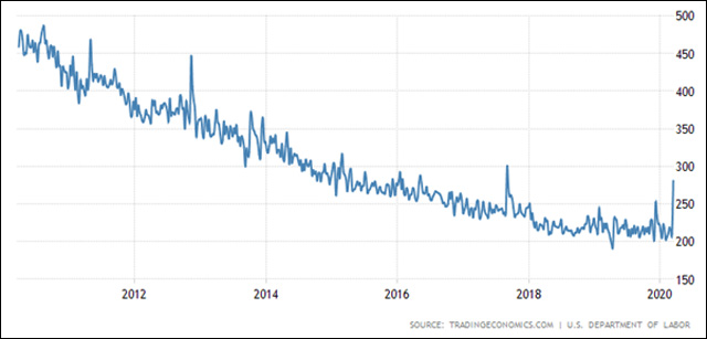 The weekly jobless claims figures jumped to 281K from 211K in the prior week, and 214K in January. Seen from January, this week’s number is 31.5 percent higher, and just by looking at the time series below it is clear that we could have seen a trend shift, and that initial jobless claims might climb higher in the weeks ahead.