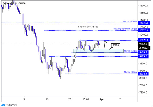 From a technical point of view, the very short-term trend in the DAX 30 will remain upwards above the March 25 low of 9409, and the price might be able to reach 10625, followed by the March 10 high of 11039. A break to the March 25 low might send the index to the March 23 low of 8234.
