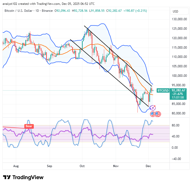 Current indicators reinforce the broader bearish tone around BTCUSD. The Bollinger Bands remain downward-positioned, reflecting sustained pressure as price movements continue tracking the lower side of the bands. This alignment suggests weakening momentum within the prevailing structure.